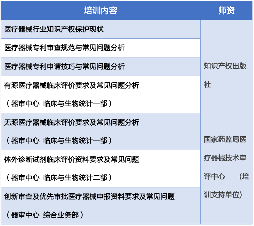 (二)本次培训由知识产权出版社有限责任公司主办、医疗器械技术审评中心支持、北京中知智慧科技有限公司承办;