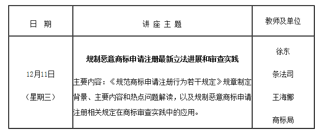 “规制恶意商标申请注册最新立法进展和审查实践”专题公益讲座(2019年12月11日)