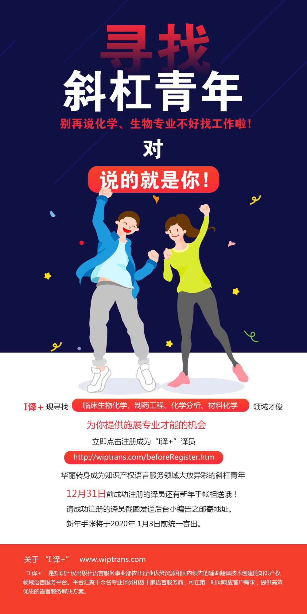 摘要:“I译+”现寻找临床生物化学、制药工程、化学分析、材料化学领域才俊, 为你提供施展专业才能的机会,华丽转身成为知识产权语言服务领域大放异彩的斜杠青年!12月31日前成功注册的译员有新年手帐相送!
