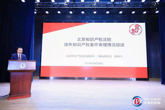 2019年10月16日,由北京市知识产权局、中关村发展集团、北京银行主办,北京知识产权运营管理有限公司(简称“北京IP”)承办的“知识产权赋能经济高质量发展——2019中关村论坛知识产权平行论坛”在中关村国家自主创新示范区展示中心举行。活动上,北京知识产权法院副院长陈锦川发布了《北京知识产权法院涉外知识产权案件审理情况综述》。