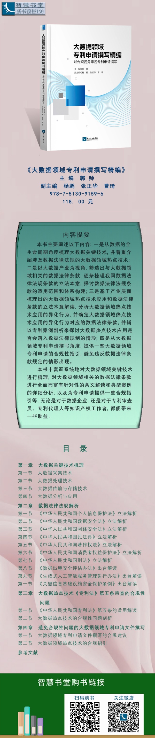 摘要:本书丰富而系统地对大数据领域关键技术进行梳理,对大数据领域相关的数据法律条款进行全面而富有针对性的条文解读和典型案例的详细分析,以及为专利申请提供一些合规指引等,无论是对于数据企业,还是对于审查员、专利代理人等知识产权工作者, 都能带来一些助益。