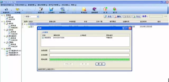 如果是新申请案件,签名通过后,案件从草稿箱中的新申请转移到发件箱中的新申请。先勾选发件箱的新申请案件,点界面上方的发送按钮,在弹出的界面中点开始上传按钮。