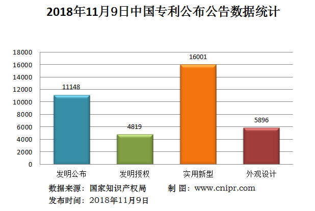2018年11月9日,中国专利公布数据统计共37864件,其中:发明专利公布11148件;发明专利授权4819件;实用新型专利公告16001件;外观设计专利公告5896件。