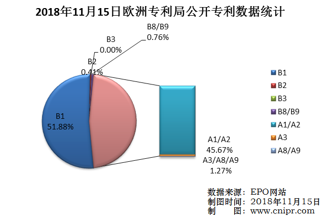 2018年11月15日,欧洲专利局(EPO)公开A类以及B类专利5395件。公布的授权专利(B1):2799件,占总公开量的51.88%;新的专利说明书(B2):22件,占总公开量的0.41%;经限制性修改程序修改后再次公告出版的说明书(B3):0件,占总公开量的0.00%;授权专利扉页的更正/授权专利全文的更正(B8/B9):41件,占总公开量的0.76%;公开新增专利(A1/A2):2464件,占总公开量的45.67%;检索报告(A3):65件,占总公开量的1.20%;扉页的更正/全文说明书的更正(A8/A9):4件,占总公开量的0.07%。