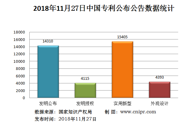 2018年11月27日,中国专利公布数据统计共38223件,其中:发明专利公布14310件;发明专利授权4115件;实用新型专利公告15405件;外观设计专利公告4393件。