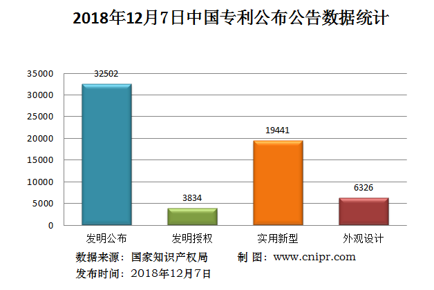 2018年12月7日,中国专利公布数据统计共62103件,其中:发明专利公布32502件;发明专利授权3834件;实用新型专利公告19441件;外观设计专利公告6326件。