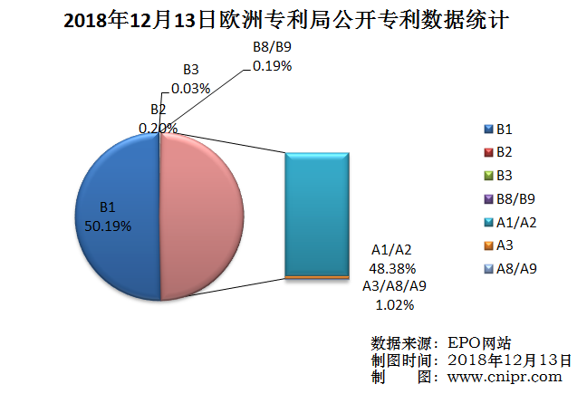2018年12月13日,欧洲专利局(EPO)公开A类以及B类专利5910件。公布的授权专利(B1):2966件,占总公开量的50.19%;新的专利说明书(B2):12件,占总公开量的0.20%;经限制性修改程序修改后再次公告出版的说明书(B3):2件,占总公开量的0.03%;授权专利扉页的更正/授权专利全文的更正(B8/B9):11件,占总公开量的0.19%;公开新增专利(A1/A2):2859件,占总公开量的48.38%;检索报告(A3):56件,占总公开量的0.95%;扉页的更正/全文说明书的更正(A8/A9):4件,占总公开量的0.07%。