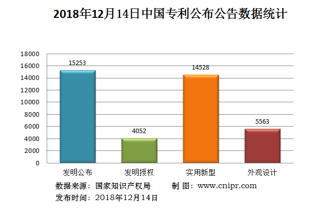 2018年12月14日,中国专利公布数据统计共39396件,其中:发明专利公布15253件;发明专利授权4052件;实用新型专利公告14528件;外观设计专利公告5563件。