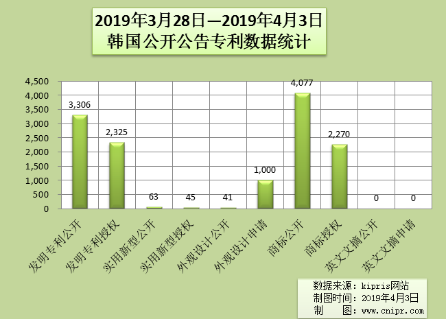 2019年3月28日—2019年4月3日韩国公开公告专利数据统计