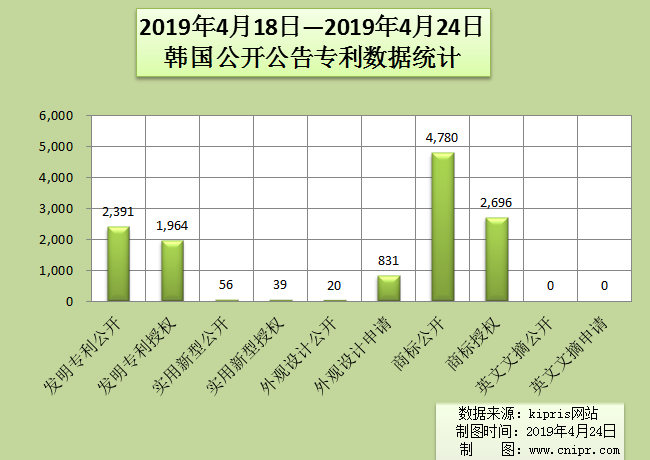 2019年4月18日—2019年4月24日韩国公开公告专利数据统计