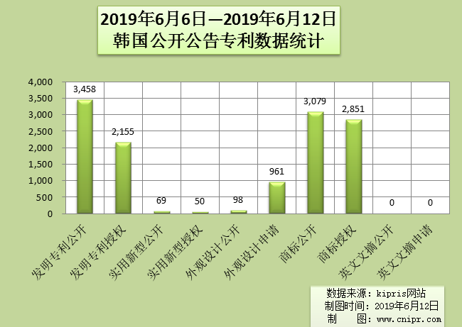 2019年6月6日—2019年6月12日韩国公开公告专利数据统计