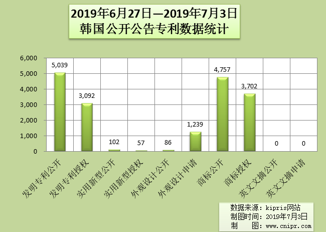 2019年6月27日—2019年7月3日韩国公开公告专利数据统计