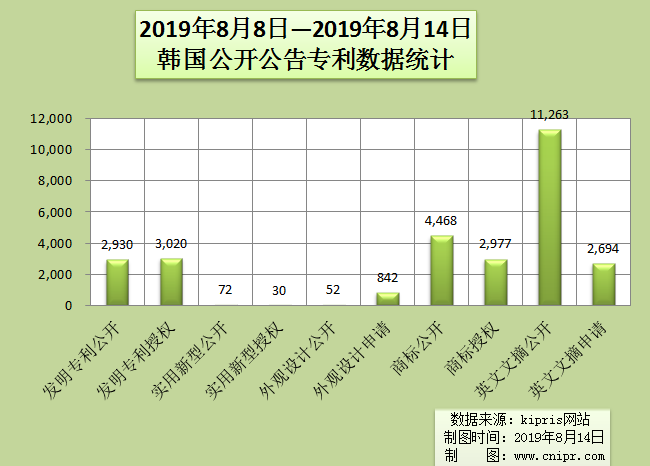 2019年8月8日—2019年8月14日韩国公开公告专利数据统计