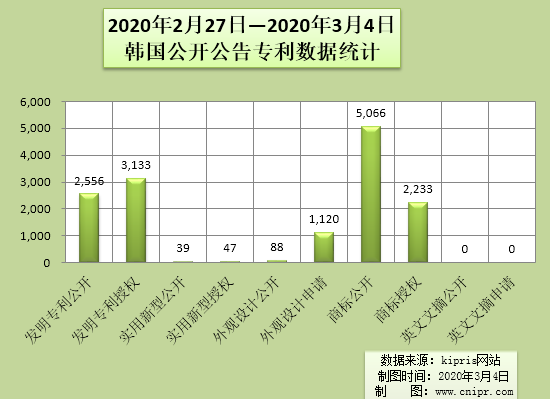 2020年2月27日—2020年3月4日韩国公开公告专利数据统计