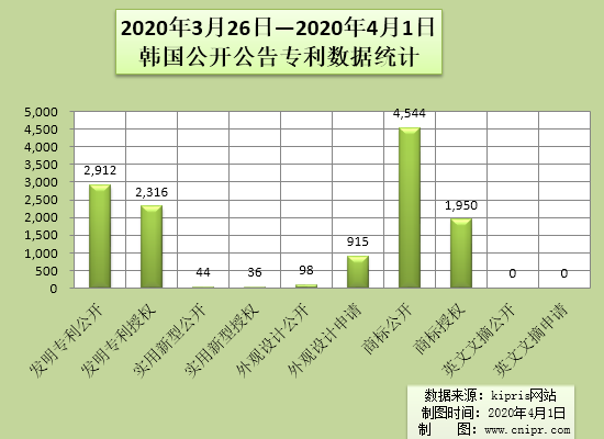 2020年3月26日—2020年4月1日韩国公开公告专利数据统计