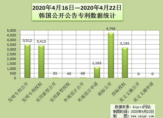 2020年4月16日—2020年4月22日韩国公开公告专利数据统计