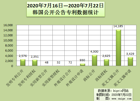 2020年7月16日—2020年7月22日韩国公开公告专利数据统计