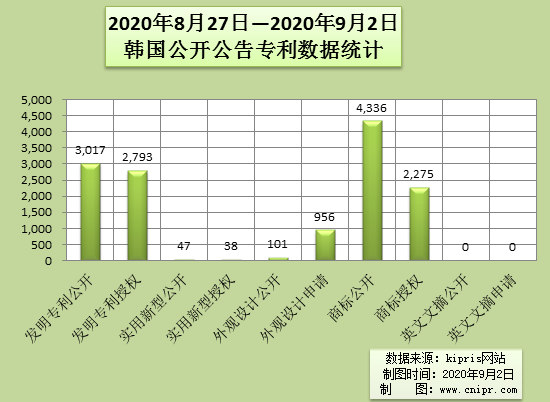 2020年8月27日—2020年9月2日韩国公开公告专利数据统计